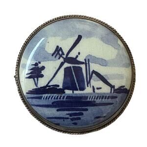 Lovely petite round white & blue Delft pottery cabochon center with a scene of a windmill set in 835 silver rope frame pin circa late 1950's, early 1960's. Hallmarked 925 (I believe that what is says - its very small & tough to read) on the c-clasp. It measures 1-3/8 inches in diameter. Preloved, the pin is in very good condition with small scratches. The Delft signature has worn off & only the D remains. No nicks, chips or cracks in the pottery. The silver needs to be cleaned & polished. The pin & c-clasp are secure. Consider the pictures to be part of the description. Don’t hesitate to ask any questions.