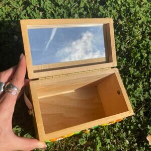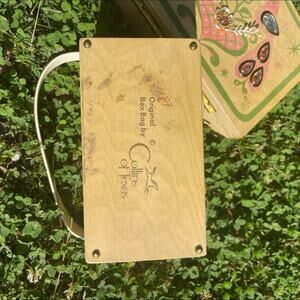 • vintage 60s MCM wooden box purse with orange, yellow, and green butterfly design on the front with rhinestone/jewel details