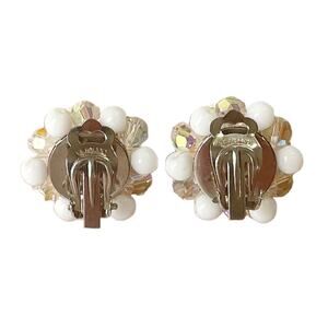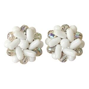 1960s Germany Milk Glass & AB Crystal Beaded Cluster Starburst Clip Earring