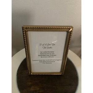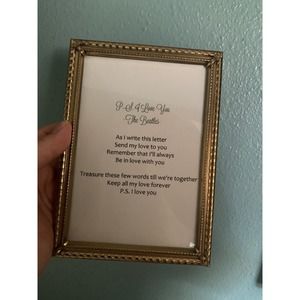 1960s gold table frame Beatles Song Lyrics .... I found this piece as you see it with the song "P.S. I Love You, The Beatles" already in it. Lyrics - "As I write this letter, Send my love to you - Remember that I'll always Be in love with you. -- Treasure these few words till we're together - Keep all my love forever ,P.S. I love you. " Metal frame is detailed and measures 7 x 5.25 inches and if you'd like to replace what is inside, it will fit a 5 x 7 photo, etc. Excellent condition.