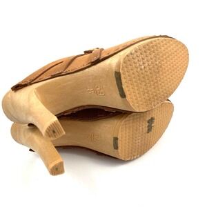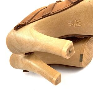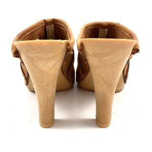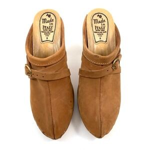 Vintage 1960's Italian crafted tan nubuck leather heeled clogs. Hand made in Italy. Genuine nubuck leather. Cross leather strap with gold buckle on sides. Marked size 39/8 (for narrow feet). 4" heels. Ball width measures 3" (narrow).