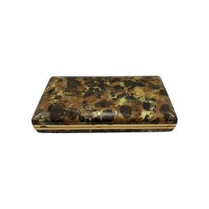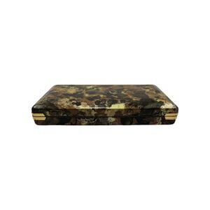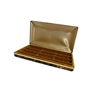 1960s vintage Mele jewelry case with a beautiful tortoise shell style pattern on the outside and a golden-yellow felt interior with holes for earrings and different compartments to keep jewelry separate.