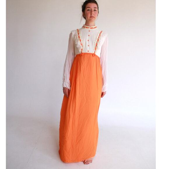 Channel your inner 1960s ingénue in this striking mod-era maxi dress, where bold style meets soft, romantic details. The bodice is layered with airy white chiffon, giving it a floaty, ethereal feel. Two sheer chiffon ribbons drop from the shoulders, framing the front in a gentle V as they meet the waist—each trimmed with embroidered orange flowers that add a playful pop of color and texture. That same floral trim circles the high neckline, giving it a structured, almost regal finish with a distinctly mod twist.