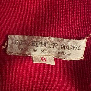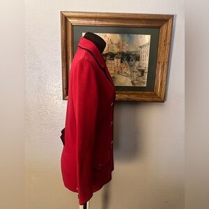 Vintage 1960s red wool double breasted cardigan sweater with gold buttons and navy trim. Vintage size 8, best fits XS-S. Shown on size 4 mannequin.