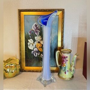 1960s Murano Jack in the Pulpit "Calla Lily" Glass Vase Stunning glass vase with a vibrant blue top and interior and clear glass encased exterior. Perfect for adding a touch of elegance to any room. Approximately 15 inches tall and 4 inches wide. Excellent condition. No cracks or chips. Stunning!