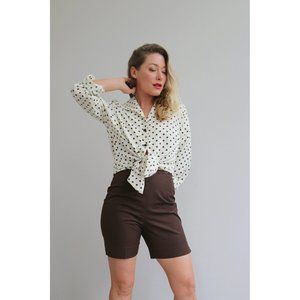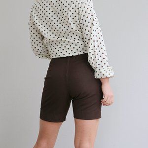 Perfectly Retro 1960's High waisted shorts in women's size xxs/xs (24" waist). Zips and buttons at the back and small slit on the side of the legs. Pleating at the waist for a fitted look. Clean front with no pockets. Fabric is a cotton and polyester blend in a a nice dark cocoa brown. Shorts looks like they have never been worn and still have the paper ILGWU union label attached.