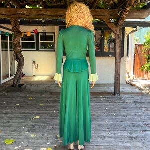 Totally breathtaking 3 piece pantsuit set circa 1960s in need of some TLC. Set includes high rise wide leg pants, button up frill sleeve top, and what appears to be some kind of bra type top (though we've not been able to figure out how it works🤷🏼♀️).