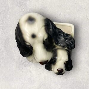 Vintage 1960s Napcoware #8953 ceramic planter featuring two adorable black and white cocker spaniels. A charming mid-century modern (MCM) piece, made in Japan, perfect for small plants or decorative display. The high-gloss glaze and realistic detailing make this an eye-catching addition to any vintage or dog-themed decor.