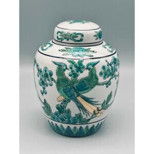 1960s OMC Otagiri Ginger Jar 6 1/2”. This beautifully detailed green and gold ginger jar with an inner and outer lid is in good preowned condition with no chips or cracks. This piece thats made in Japan has a crazing design with pheasant birds, cherry blossoms and peonies. Sticker on bottom is partially removed. This Jar measures approximately 6.5” x 4.5”.