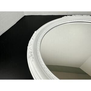 The product is a vintage 1960s oval mirror with a shabby chic design, featuring an ornate white frame finish. The mirror has a unique and elegant style that adds a touch of retro charm to any space. With its recessed design and classic oval shape, this mirror is a timeless piece that can enhance the look of a room with its vintage appeal and intricate framing. An ideal addition for antique collectors or those looking to add a touch of nostalgia to their decor.