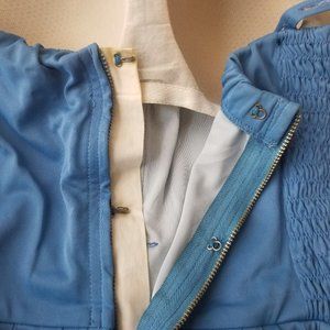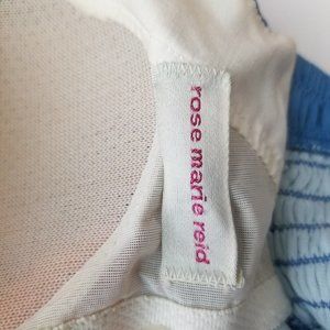 vintage 1960s/1970s Rose Marie Reid periwinkle blue swimsuit. side smocking. attached skirt. 12" metal zipper, hook & eye back closure. plastic mesh molded cups & elastic bust support. straps are adjustable with buttons. elastic is in good condition for age. nylon fabric has little stretch. minor wear: tiny hole near left strap button, fading/discoloration on skirt hem, faint stain in crotch (has been stain treated & laundered several times).
