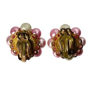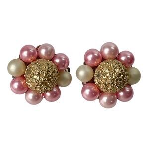 1960s Signed Japan Pink White Plastic & Textured Gold Plate Beaded Clip Earrings