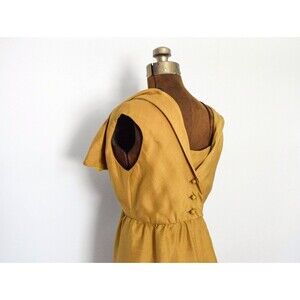 A gorgeous 1960s mini dress. This sleeveless dress features soft copper toned woven silk construction with chartreuse detailing on front, v- neck with large collar, v-back with buttons and zipper closure.