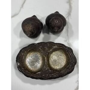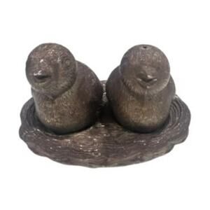 Design: Two realistic bird figurines that double as salt and pepper shakers, sitting atop a detailed silver-plated nest.