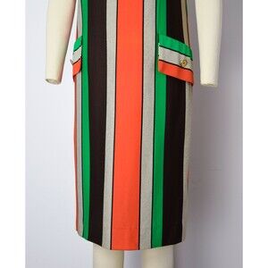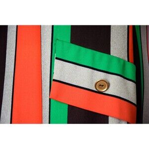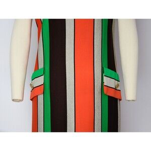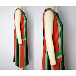 A late 1960s shift dress featuring scoop neck, vertical striped fabric in orange, green, beige, and dark brown tones, with shift silhouette, faux flap pockets with button detail, and rear metal zipper closure.