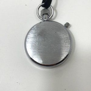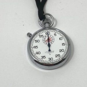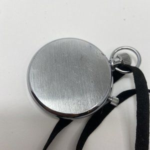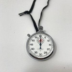 Very good vintage Swiss made, La Marque 7 Jewels stopwatch. Including reset button, minute hand metal needle indicating 0-60 minutes, second hand metal needle that indicates the 60 equal divisions (seconds) of a minute the stopwatch, start/stop knob which then display the precise amount of elapsed time. Measures 1.75" in Diameter.