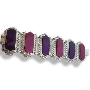 Fun vintage chrome silvertone panel bracelet from the 1960s with large thermoset pink and purple lucite. Bracelet measures 7 inches in length and 2 inches wide. Bracelet is in overall good condition however the very tip of the next to last panel of bracelet is broken off as seen in very last pic. This isnt very noticable right off unless you look for it. Bracelet has a fold over style clasp.