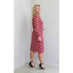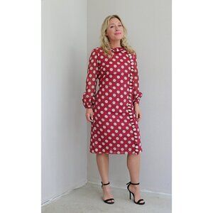 1960's Maroon and polka dot day dress in women's size md to lg. Dress zips up the back and is fully lined. Ruffled edge collar with full ruffle down the front of the dress. Semi sheer with cuffed sleeves. Fabric is a non stretch cotton blend. In excellent vintage condition with no flaws to note.