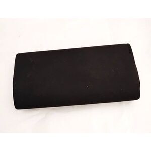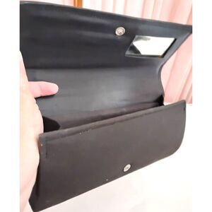 Vintage 1960s black fabric clutch with red rose embroidery and built-in mirror. Measures 9 x 5 inches. Has a snap compartment inside. Some spotting and light wear. Snap closure, matte finish.