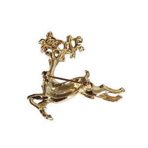 This three dimension leaping deer pin is in gold tone metal and his antlers are studded with bright red rhinestones. Also a highly detailed face.