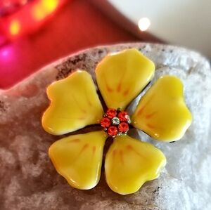 1960's Vintage Flower Power Brooch Yellow Enamel With Rhinestone Center