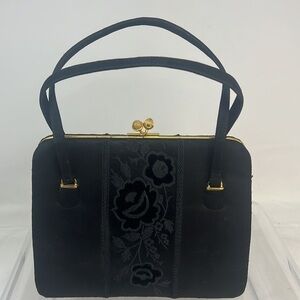 This is a spectacular 1960’s Vintage Gucci Matter Silk Satin Structured Hand Bag Purse - Very Rare. Goldtone frame with acorn kisslock closure. Full silk exterior with velvet floral inlay. Full satin silk interior with three slip in pocket - one bravo d the zipper pocket and the two on the opposite wall of the bag. Very roomy bag. There is minor corner wear. No odors. No stains.