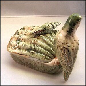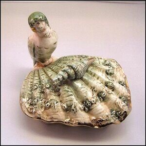 The box and the lid is a Tridacna clam shell design in white and soft green glaze with metallic gold accents. Perched on one corner is a large parakeet and the top of the box is finished with a conch shell that serves as a handle. The box, the lid, and the bird are all in pristine condition with no wear, chips, or cracks.
