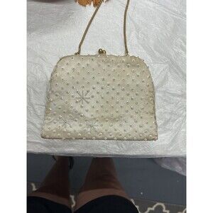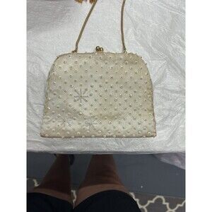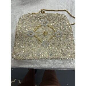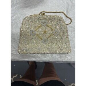 1960s Vintage Off White Beaded Handbag With Gold Trm and Hardware
