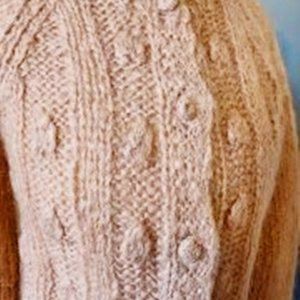 A 1960s vintage larger plus volup size chunky warm all wool hand knit in Italy cardigan sweater in a deep peachy brown shade. Bust 40. Hand Made in Italy for the Hecht Co. A heavy loose woven wool sweater with raglan sleeves and long sleeves. A round neck with sweater covered buttons. A longer length and a size large. The design has leaf design shapes along with cable knit. It was a hard color to capture. It is closer to the 4th photo. This is the heavy warm wool that is somewhat scratchy. A large size. Bust 40 Waist to 40 Bottom to 42 24" long. It does stretch. Long full sleeves. A smaller size can wear this sweater. In very good condition with no holes or stains. It could be fluffed in the dryer to fluff the wool. fall winter preppy sixties classic ladylike