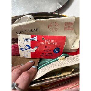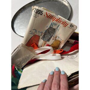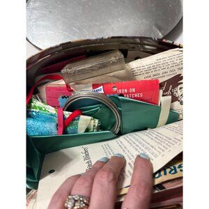1960s Vintage Tin With Assorted Sewing Notions & Patterns