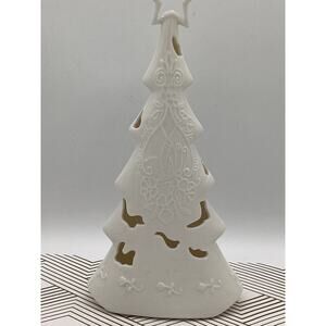 Add a touch of vintage charm to your Christmas decor with this lovely white pierced Christmas tree candle holder. This medium-sized porcelain tree, measuring 11.5 inches in length, features a glossy finish and is illuminated to create a warm and cozy atmosphere in your home. The tree is a 1960s style, limited edition, and retired item that is perfect for collectors.