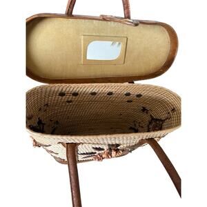 1960s Vintage Woven Straw & Tooled Leather Floral Handbag Mirror