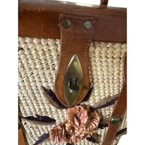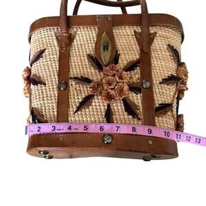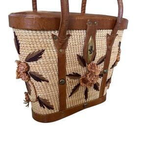 1960s Vintage Woven Straw Leather Floral Handbag Tote Purse Collectible Bag