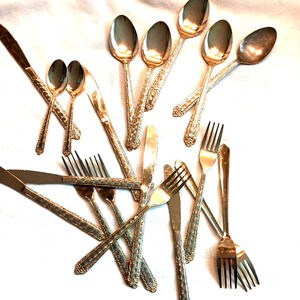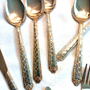 VINTAGE with wear, normal light scratches, wear. ONE spoon is very worn off on the spoon part. See photos. This can easily be gold electroplated again if you want to getbit done, or just don't use that one spoon. Sold as is.