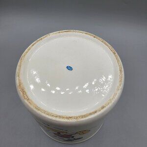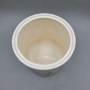 Originally would have had a lid, but it is missing. Great size for a kitchen utensil crock or paint brush storage.