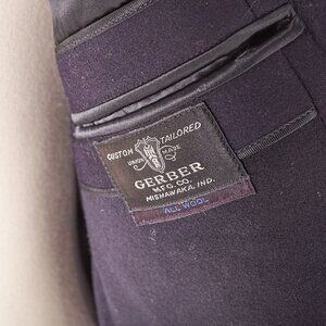 The coat is in great condition. Navy Blue color with blue stripe on each sleeve and gold button. Made of wool. There are 2 pockets on the outside as well as a breast pocket and 2 on the inside. Made by Gerber MFG. Co. Button holes on both sides to button both ways and still give double breast. Measures 60 cm across chest, 50 cm across shoulders, 64 cm sleeves, 94 cm long.