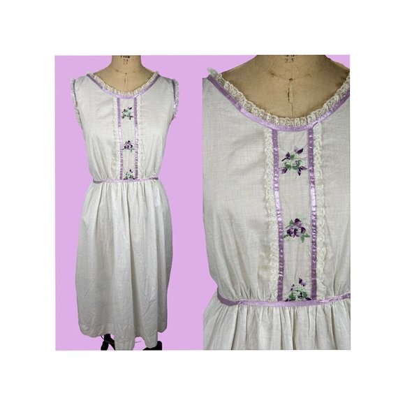 Sweet 60s cotton nightgown (could also be a sundress) with embroidered flowers on the bodice, lace trim and satin ribbon trim and belt. Made by Fern Lingerie of New York. Good condition.