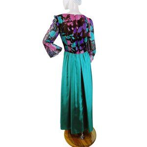 Absolutely gorgeous 1960s gown with a sheer striped floral silk chiffon bodice and bell shaped sleeves combined with an emerald green silk taffeta gathered skirt. The bodice is lined with beige silk. There is an under layer on the bodice made of black silk that is seen through the chiffon. Nylon zipper up the back. Pockets on each side of the skirt. Good condition with a couple of very faint spots on the skirt as pictured. This is really a beautiful gown! Posh by Jay Anderson.