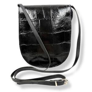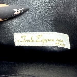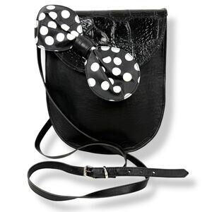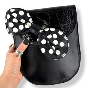 Vintage 1960's handmade black leather polka dot bow handbag by FREDA ZAPPAN. Crafted in Philadelphia, Pennsylvania. Vegan friendly faux leather. Top half is shiny patent leather crocodile print with a large Minnie Mouse like polka dot bow. Snap closure on front. Inside is clean black faux leather with designers logo. Adjustable strap with buckle. This little vintage gem is in excellent like new condition!