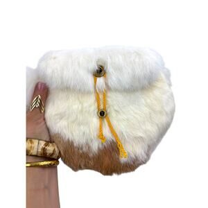 1960's handmade rabbit fur purse, Gold anchor button with string closure. Fully lined in red leather. 9” x 8.5”.