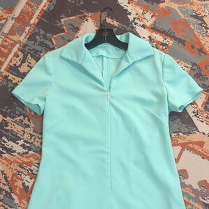 Stretch jersey Mod style dress has a collared, neck, princess seaming. The knee-length skirt is slightly flared Closes with a zip in the front and is unlined. The fabric label reads "Polyester and other fiber 1960s.