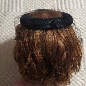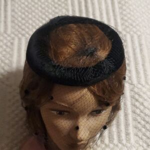 1960s black velvet ring hat with netting and feathers. Tiny pom poms scattered on the face net.