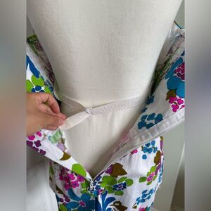 This incredible 1960s Peter Pan Sunblazer’s Swimsuit/ Dress is in absolute excellent condition, it’s almost like someone stored it safely and rarely or never wore it. It has extra cups attached that you can insert into the bra to achieve that point chest look that was popular at the time. It attaches with a little plastic bit, however the left cup is missing it’s plastic bit. It has a strap that goes around the bust and to the back that can be adjusted. The straps can also be adjusted with a button closure. At the top of the zipper there’s a metal snap so you can secure the swimsuit dress before zipping up. There’s also a waistband that can be adjusted to make it look snazzier. This is a swimwear piece and marketed as such but it doesn’t have any underpants built in, it’s like a dress in that sense. Made of 100% cotton.
