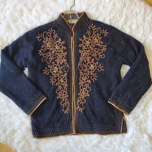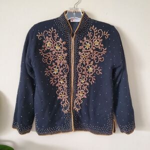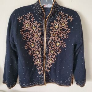 1960s Gold & Black Beaded Cardigan- L, Vintage Wool Sweater Mandarin collar Glam