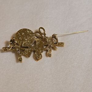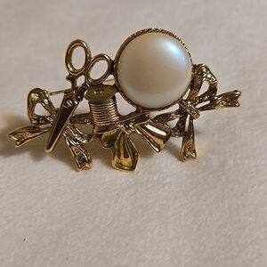 This vintage brooch features a stunning gold tone design of scissors, thread, ribbon and a faux pearl button.