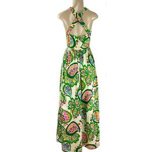 Absolutely exquisite vintage Jerry Marsch for Mardi Gras maxi dress. Zippers back with hook and eye closure. Straps can be worn 2 ways. Rear buttons domed orange crystals also has multi colored embedded crystals on floral details.