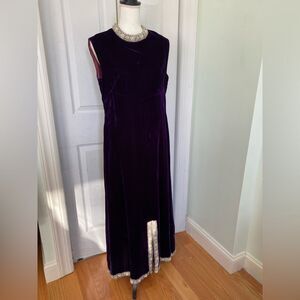 This wonderful dress is a vintage maxi dress from the '60s it is in EXCELLENT condition considering its age, it has trim all along the bottom hem and around the collar the trim is bedazzled with beads and silver thread. The dress is lined as well. There are some scuffs here and there as pictured but otherwise in excellent condition.