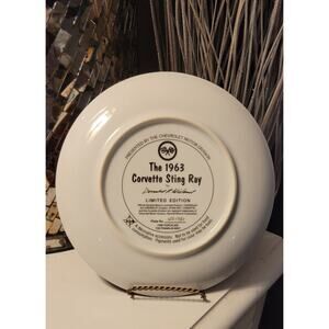 The product is a limited edition porcelain collector plate of a 1963 Chevy Corvette Sting Ray by artist Donald Wieland, produced by Franklin Mint in the late 20th century. The multicolor decorative plate was manufactured using pottery techniques in the 1990s. This art pottery piece adds a unique and collectible touch to any decor for car enthusiasts and collectors alike.