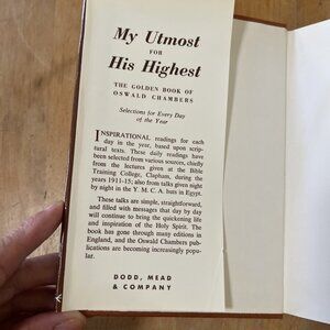 The product is a hardcover book titled "My Utmost for His Highest" by Oswald Chambers, published in 1963 by Dodd, Mead. This nonfiction book explores themes of religion and beliefs, and it includes a dust jacket. The book is written in English and is dedicated to offering guidance and inspiration for those seeking a deeper understanding and connection to their faith.