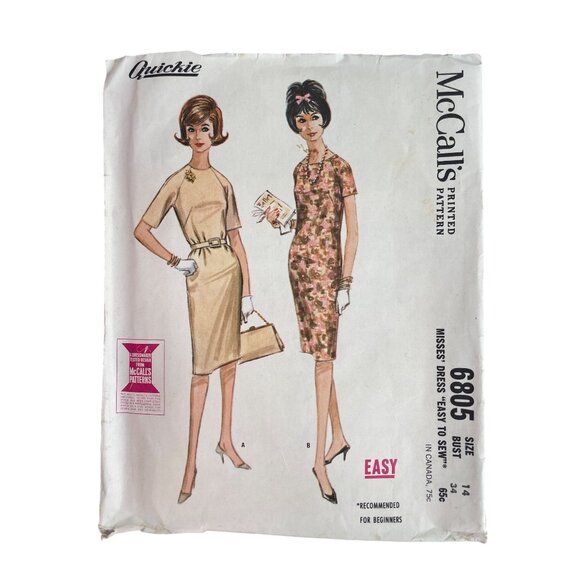 This 1963 McCall's 6805 sewing pattern for a Misses' dress is CUT and previously used but complete. Suitable for size 14 (bust 34), it offers a simple, classic design featuring raglan sleeves, French darts, and options for belt or belted looks. A guide for beginners, it includes instructions and carefully marked pieces to enhance ease of assembly. The original envelope shows some wear due to age.